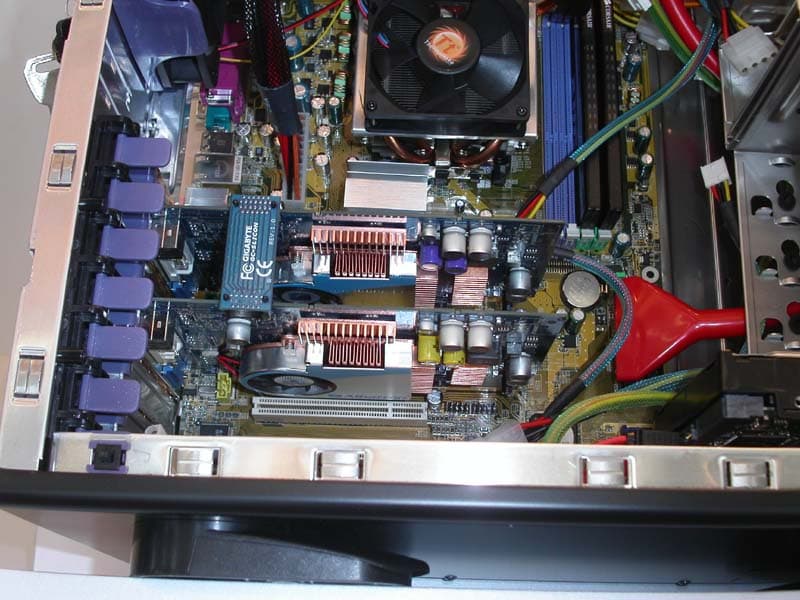 PC SN26P — это SLI решение в малом форм-факторе. Чипсет nForce 4 SLI, Socket 939, аудио на базе VIA Envy 24PT 7.1, гигабитный сетевой контроллер, 2 видеокарты GeForce 6800GT THD, производства Leadtek, по 256 МБ DDR3 на карту, система охлаждения на основе тепловых трубок, при этом система оснащена дополнительным питанием. Видеокарты стоят плотно друг к другу, но работа гарантирована, за счёт особого теплорегулирования и охлаждения внутри непросторного корпуса. Видеоподсистема поставляется отдельно как опция или вместе с barebone-системой в виде кита.