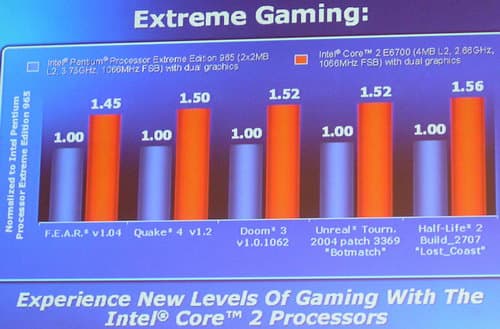 В частности, Intel демонстрировала 2 сравнительных игровых стенда — один ПК на этих стендах был Conroe, другой на одночастотном с ним двухъядерном Athlon 64 FX (остальные компоненты идентичны), — где вживую запускались игры (точнее бенчмарки) DOOM 3 и HalfLife 2.