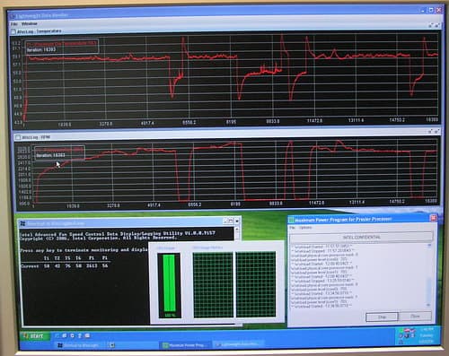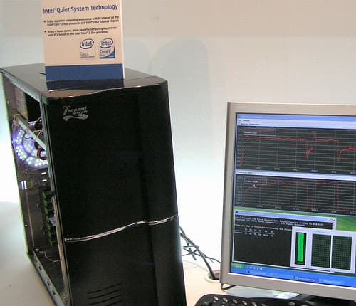 В противовес мощным и достаточно горячим топовым игровым системам Intel демонстрировала и специальную интеллектуальную технологию Intel Quiet System Technology (входящую в состав новых чипсетов Intel 965) для оптимизации (снижения) шума при охлаждении новейших систем на Core 2 Duo.