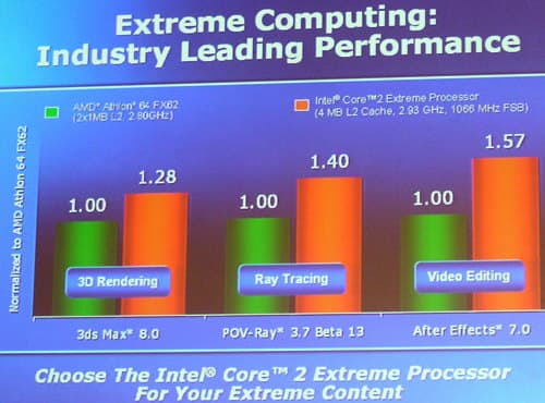 Тем более что Intel чуть ли не на каждом шагу старалась продемонстрировать скоростные преимущества своей новой платформы, сравнивая ее как с топовой игровой системой на Presler (Pentium Extreme Edition 965), где в играх обеспечивается более чем 50-процентное превосходство,