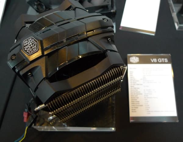 Что же касается процессорных кулеров, то наиболее весомым из них во всей линейке у Cooler Master выступает сейчас массивный V8 GTS, вот он на фото ниже. Эта модель также уже была ранее показана во время весенней CeBit 2013. При габаритах 154×149×160 мм изделие весит 1140 г. Для обдува радиатора служит пара 140-миллиметровых вентиляторов, закрепленных на алюминиевых пластинах, насаженных на тепловые трубки диаметром 6 мм, собранные в три блока. Каждый вентилятор может вращаться со скоростью 600—1600 об/мин, ежечасно перемещая от 47,6 до 139,3 кубометра воздуха.