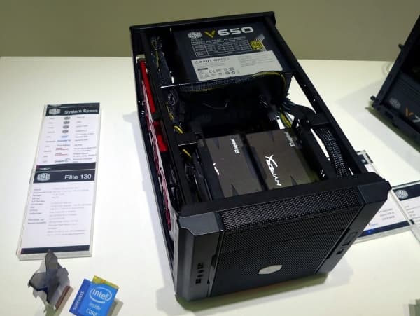 Второй из корпусов «любимчиков», который не преминут продемонстрировать вам представители Cooler Master в новом сезоне, это миниатюрный Elite 130, который особенно трогательно смотрится среди всех этих «башень»-гигантов за счет своих компактных размеров и необычной формы. Elite 130 является прямым потомком представленной в прошлом году модели Elite 120. Полностью решетчатая передняя панель позволяет добиться лучшей вентиляции воздуха, отчего внутри компании новую модель называют «дырявой версией Elite 120» (Mesh version of Elite 120). Корпус хоть и весьма компактный, однако способен вместить в себя и полноценный видеоускоритель (до 343 мм), и полноразмерный блок питания (до 180 мм), три 3,5-дюймовых и один 5,25-дюймовый отсек, и даже может быть оборудован системой жидкостного охлаждения, что и было продемонстрировано на стенде при помощи установки сюда системы Seidon 120M (корпус оснащен штатными местами под фронтальный вентилятор 120 мм, а также имеет боковое охлаждение с помощью вентилятора 80 мм). Elite 130 имеет габариты 240×207,4×401,4 мм и предназначен для установки в него материнских плат форм-фактора Mini-ITX.