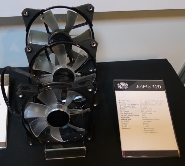 В стане представителей воздушного охлаждения среди спектра «легкомысленных» разноцветных вентиляторов Cooler Master JetFlo 120, впервые продемонстрированных еще во время CeBit в Ганновере, на стенде были также замечены и «серьезные» процессорные кулеры серии V8. 120-миллиметровые вентиляторы Cooler Master JetFlo 120 имею LED-подсветку, а с помощью ШИМ их скорость регулируется в диапазоне 800—2000 об/мин. При этом максимальная производительность достигает 144,4 м³/ч.