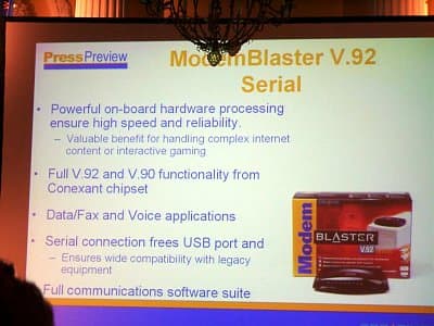 Сreative заявляет, что спрос на аналоговые модемы продолжает оставаться высоким, несмотря на развитие других технологий подключения к интернету, поэтому компания не собирается оставлять этот рынок. По оценкам, приведенным в процессе выступления, обычные аналоговые модемы будут пользоваться спросом 2005 года.