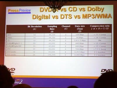 Для демонстрации преимуществ нового стандарта на пресс-конференции прокрутили несколько композиций в формате DVD-аудио — The Corrs, Eric Clapton и еще одну песню. Новый формат имеет лучшее разрешение (24-бит и до 192 кГц), более широкий частотный диапазон, использует меньшую степень сжатия (причем используется алгоритм сжатия без потерь), возможность кодирования в формат 5.1. И, надо сказать, все эти преимущества очень хорошо слышно. Некоторое впечатление о разнице можно получить, сравнивая файлы МР3 при простом прослушивании композиций и прослушивании с различными улучшателями звука (типа DFX и пр.), однако там, как правило, страдает ясность и чистота звука — в данном же случае качество звука превосходное. То же самое касается записи в формате 5.1. Общеизвестно, что даже если стереосигнал раскидать на 4 колонки и сабвуфер, впечатления от прослушивания намного улучшаются. А уж если записывается 4 отдельных канала (и отдельные центральный канал и сабвуфер), то можно себе представить, насколько улучшится впечатление от прослушивания. Звук 5.1 уже встречался в формате DVD-видео, однако там все-таки главнее картинка, поэтому звук достаточно сильно сжимался, и многие детали терялись. Вот примерное соотношение существующих на рынке стандартов.