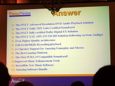 Особый упор делается на высочайшем качестве звука, выдаваемого картой. Карта действительно была здорово переработана: новый аудиопроцессор, новый стандарт звука, новые дорогие кодеки… Впрочем, технические характеристики уже рассматривались, поговорим немного о маркетинге.
