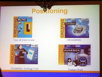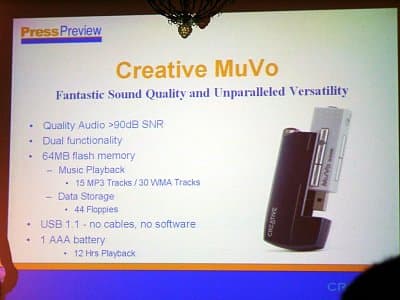 Отдельно хочется рассказать о Creative MuVo — плеере на основе флешпамяти. Основной его чертой является то, что он совмещает функциональность плеера и флешдрайва под USB. Очевидно, этому плееру будет посвящена отдельная статья, поэтому здесь особо распространяться о функциональности не буду, скажу лишь, что такое решение очень удобно — например, чтобы подключать его к компьютеру, не нужно иметь дополнительный кабель с нестандартным разъемом. Не могу также не отметить великолепный дизайн — темно-синий «с искрой» батарейный отсек и молочно-белый корпус модуля с серебристыми кнопками создают очень красивое сочетание. Единственный, на данный момент, недостаток — маловата емкость, всего 64 МБ. Впрочем, это обещают исправить: на подходе версия со 128 МБ.
