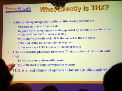 Думаю, пора уже закругляться с дифирамбами, касающимися возможностей домашнего кинотеатра. Напоследок кратко поговорим о поддержке нового стандарта Dolby Digital EX, который отличается поддержкой дополнительного заднего центрального канала. Основное декларируемое преимущество — благодаря этому вокруг пользователя создается полностью реалистичная звуковая картина и улучшается качество спецэффектов, когда источник звука находится точно за (вверху и сзади) зрителем или перемещается вдоль задней полусферы. Для иллюстрации новых спецэффектов, на презентации прокрутили небольшой отрывок из Star Wars I (гонки на рейсерах), однако, скажу честно, особых преимуществ от дополнительного заднего канала я не ощутил (может, сидел неудачно?).