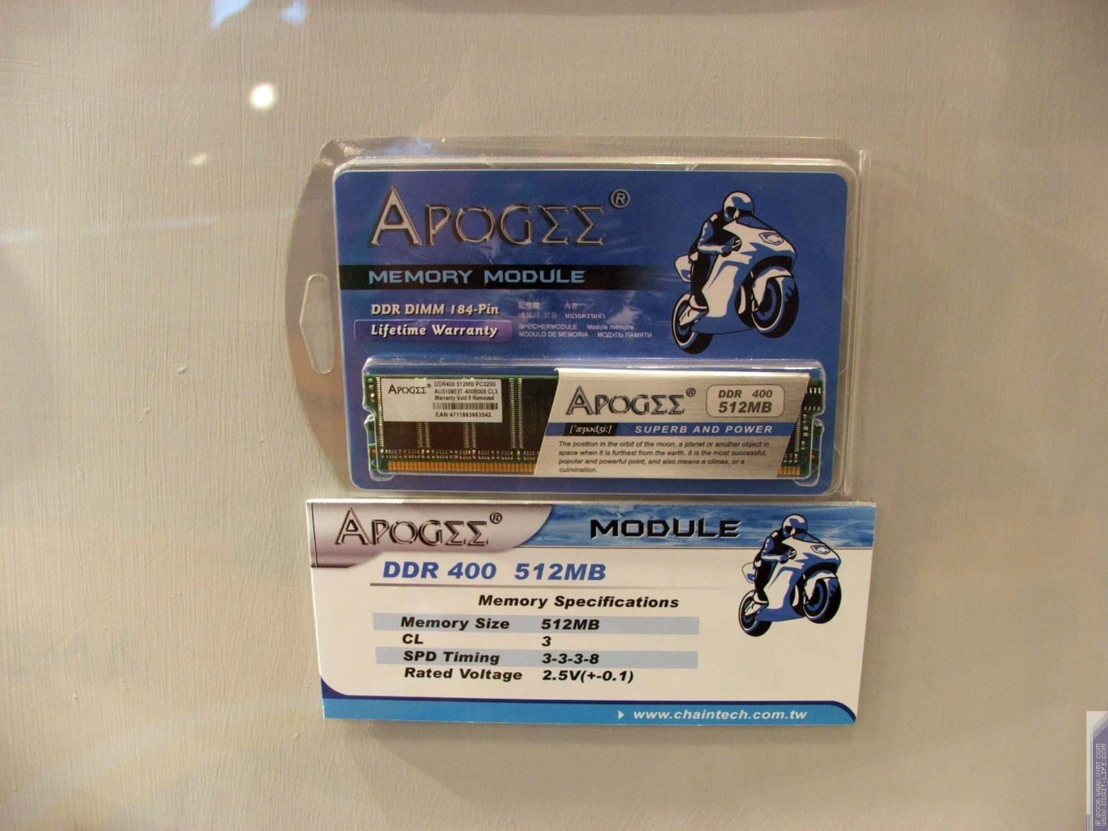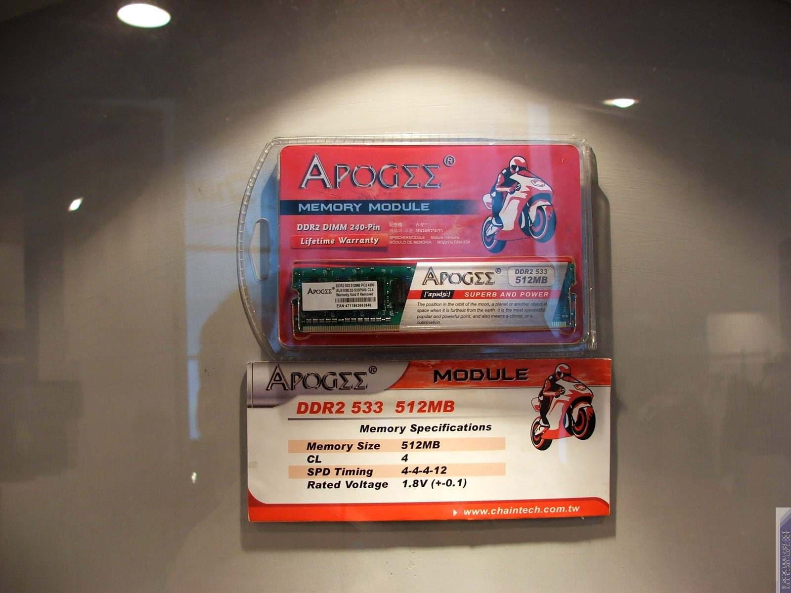 Ну и конечно, новинки от Chaintech — всевозможные модули и микросхемы памяти. Для этого вида продукции была выбрана известная марка APOGEE.