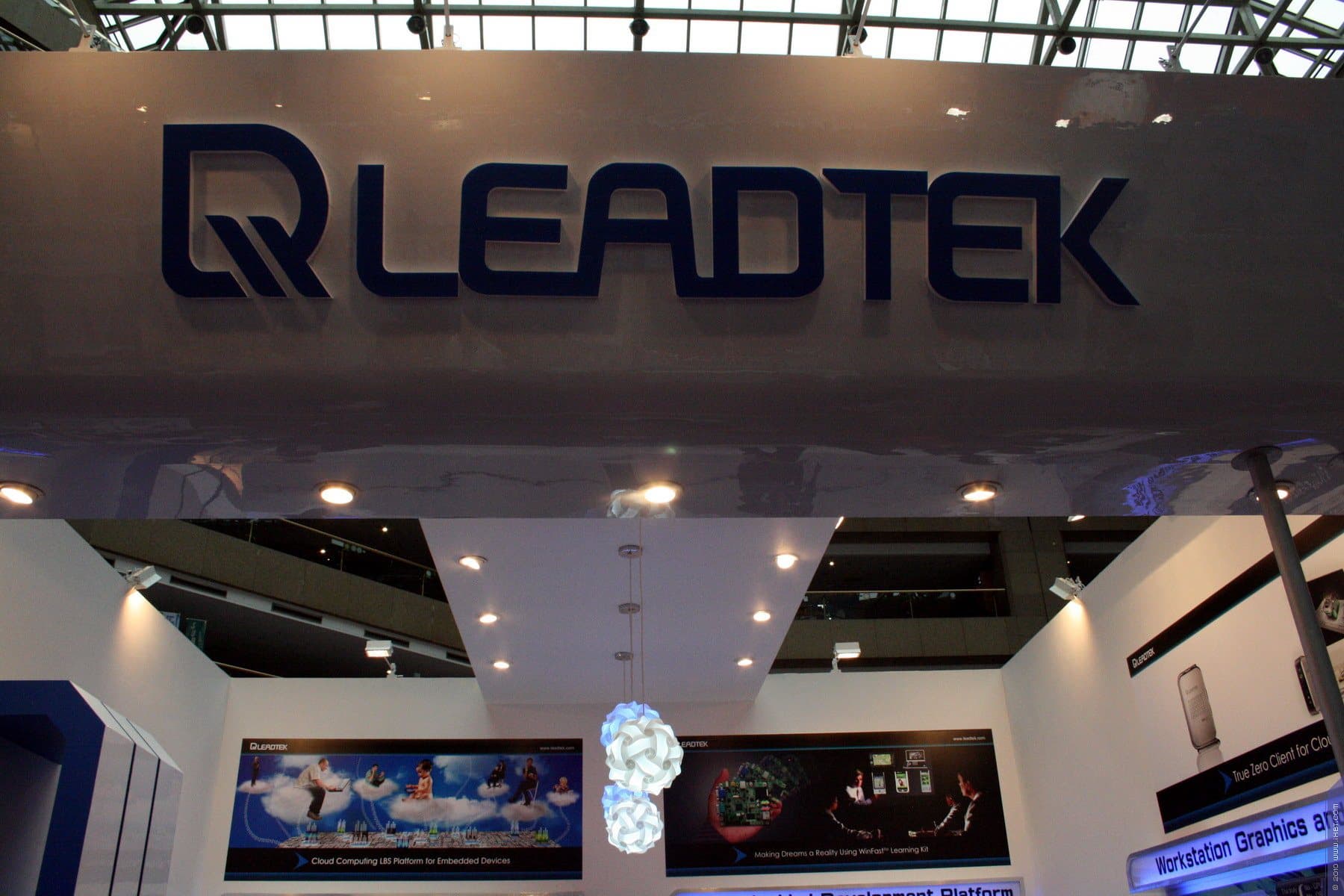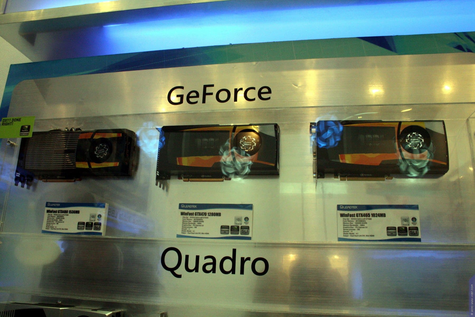 В том же зале находился и стенд Leadtek. К моему огромному сожалению, некогда известная своими уникальными решениями в области видеокарт компания как-то сильно охладела к данному виду бизнеса, и почти все видеокарты под маркой Leadtek на деле являются копиями референс. Крайне тяжело найти какую-то интересную разработку по видеокартам от инженеров этой компании. А ведь еще лет пять-семь назад имя Leadtek гремело и пользовалось огромным авторитетом не только из-за интересных решений в области охлаждения, но и из-за безупречного качества продукции. Ныне же мы видим видеокарты, произведенные даже не самой компанией Leadtek, а купленные у NVIDIA референс-образцы, снабженные соответствующими стикерами.