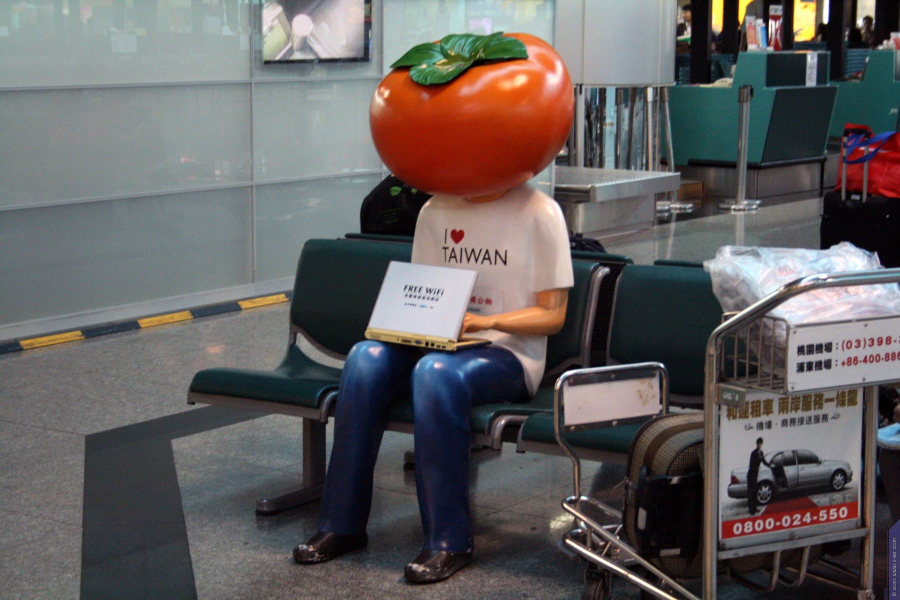 На его мансардах приютились рестораны и кафе. Сразу же был замечен «Хлеб-соль» — русский ресторан. Даже как-то необычно было видеть его тут, в Тайване. Но это еще что, вот реклама бесплатного беспроводного интернета сидела в одном из кресел с головой из помидора, явно намекая на те последствия, которые могут наступить, если сидеть в интернете день и ночь! :) Я даже вначале подошел, надеясь прочитать, через какое время после пользования тут интернетом можно стать сеньором Помидором.