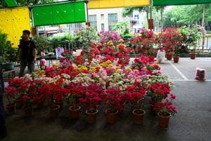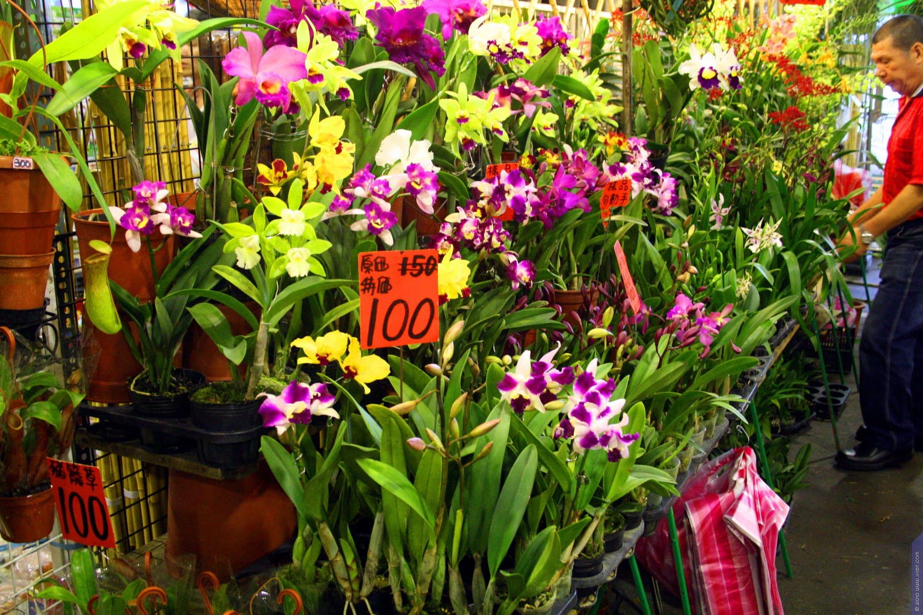 Поскольку это был выходной, рано утром я успел съездить на цветочный рынок выходного дня, который, как понятно из названия, работал только по субботам и воскресеньям. Открыт он был 10 лет назад вместе с аналогичным рынком камней (где можно купить всевозможные изделия из полудрагоценных камней типа оникса, нефрита, агата и т. д.). Рынки выгодно используют пространства под большой автотрассой, идущей на эстакаде, поэтому о крыше уже можно не беспокоиться. А это ведь очень существенный фактор, учитывая, что погода все плакала и плакала, и непонятно, то ли по поводу того, что вообще сюда понаехали на выставку, то ли наоборот, что выставка кончилась и все разъезжаются. Но проливные дожди, изливающие влагу часами, существенно помешали бы насладиться красотой цветов, был бы рынок под открытым небом.