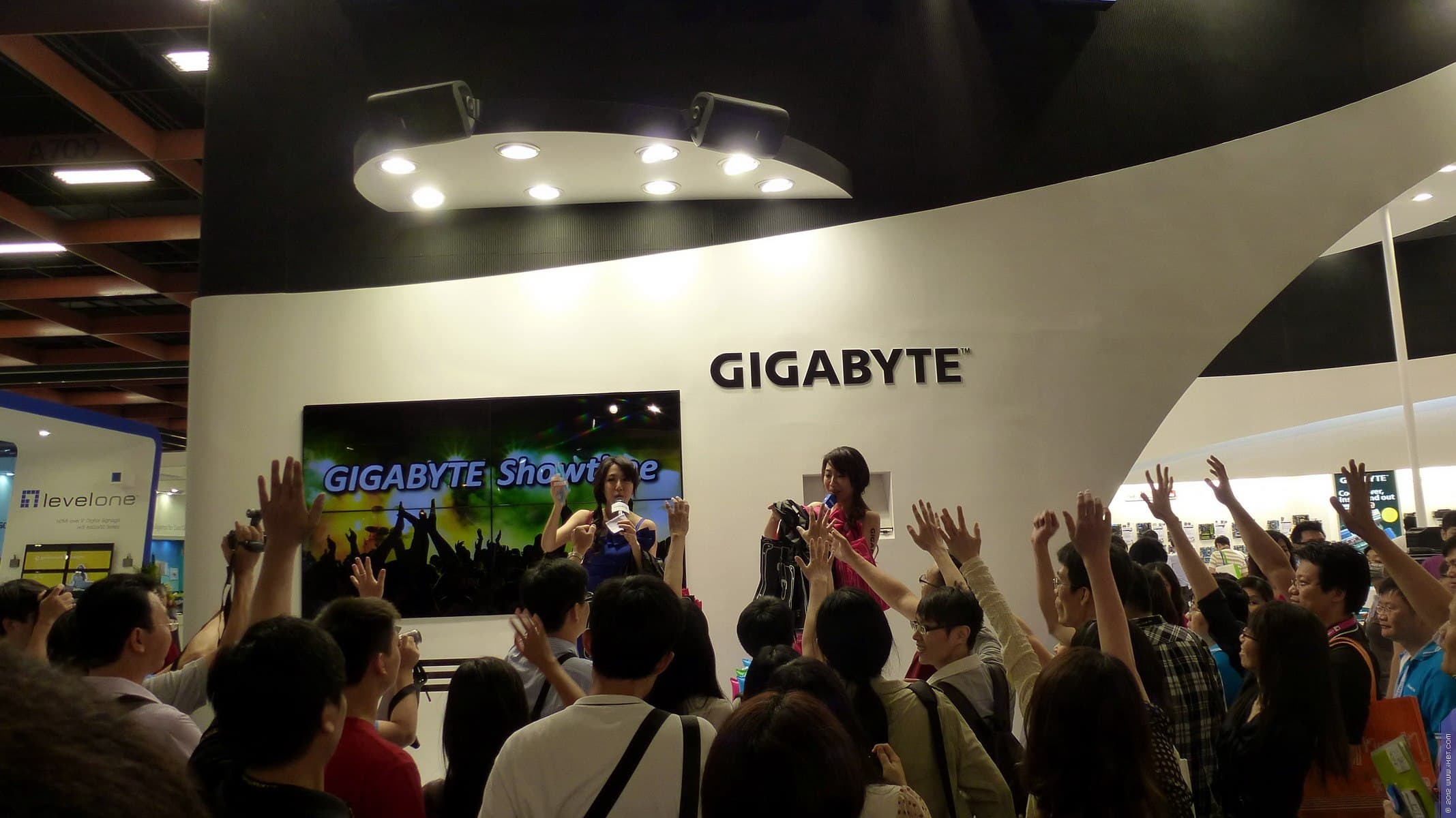 Ну и в традициях Gigabyte — устраивать шоу, когда призывают публику орать во всю глотку «G-I-G-A-B-Y-T-E» чтобы получить великий приз — надувную палочку с лого Gigabyte :-)