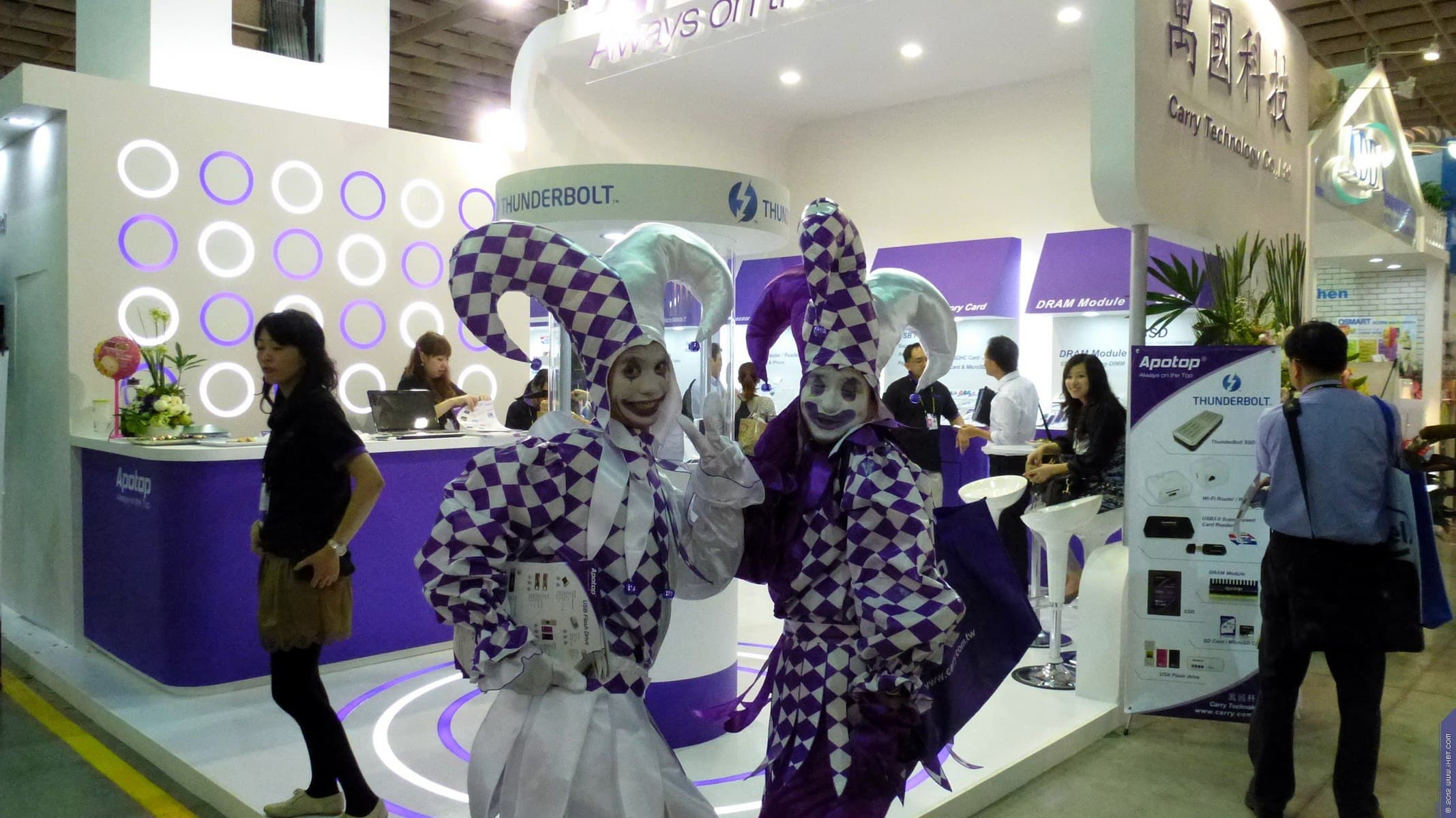 Вот пример странного пиара. Эти образы я помню чуть ли не с 2006-2007 годов, каждый год по выставке ходит сладкая парочка существ с печальным и веселым лицом (надеюсь, что между выставками они в таком виде не живут :-)). Печальный олицетворяет собой устройство с подключением с проводной сети (в качестве хвоста у него болтается штепсель), а веселый олицетворяет собой беспроводное устройство.