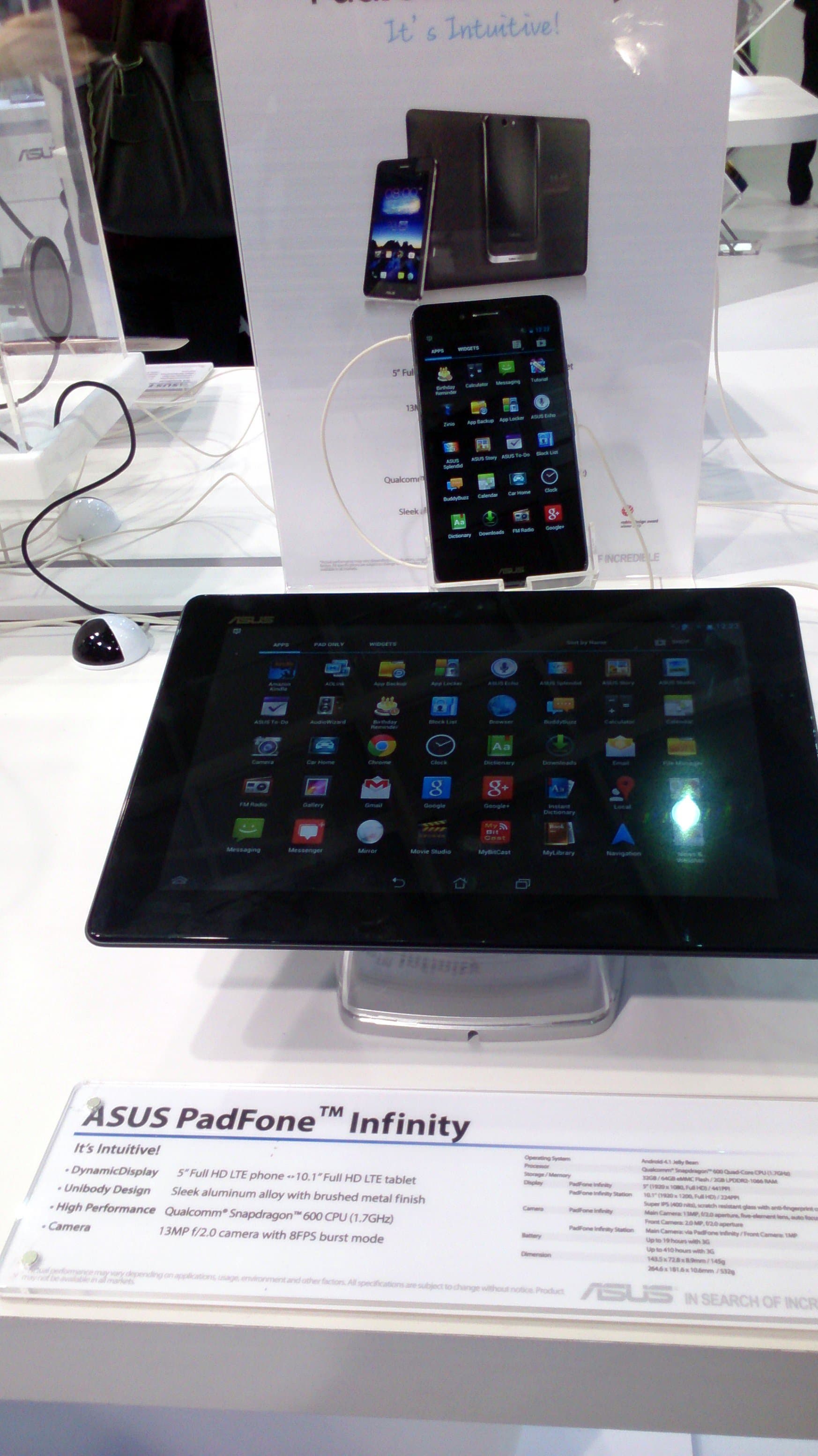 | Конечно же, изюминкой мобильного сектора продуктов ASUS является знаменитый ASUS PadFone Infinity. У нас также есть по нему обзор. Это самый современный и топовый смартфон, который трансформируется в планшет путем установки в ASUS Padfone Infinity Station. Собственно, все детали в обзоре. На стенде присутствует и ASUS Memo Pad HD7, который также уже детально исследован коллегами. Это семидюймовый планшет, имеющий весьма достойную и современную архитектуру: однокристалльную SoC MT8125 c 4-ядерным CPU, 1 ГБ оперативной памяти и флэш-накопитель на 16 ГБ. Остальные детали также в обзоре. | ![]() |