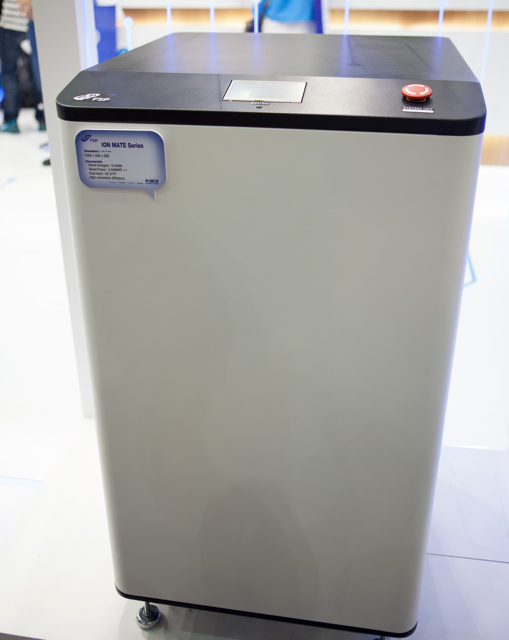 Одно из центральных мест в экспозиции компании занимал аккумуляторный источник питания для загородных домов FSP Ion Mate Series. Он рассчитан на выходную мощность 2,4 кВт, его габаритные размеры составляют 1000×540×650 мм, а емкость — 10,5 кВт·ч. То есть даже при пиковом потреблении в 2,4 кВт такого источника хватит более чем на 4 часа.