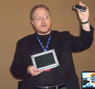 Практическая иллюстрация данного постулата. В левой руке выступающего — первый смартфон от НР, а именно iPAQ 514. Ух, как же по нему прошлись техноманьяки из всех изданий при тестировании: и такой он, и сякой — малофункциональный, поскольку не мультимедийный, а не мультимедийный, поскольку дисплей у него мелкий, и вообще — позор такому экрану в 2007 году, когда у многих телефонов лучший стоит. И камера там никакая, и как плеер он не интересен. А продажи идут весьма активно, счастливых обладателей все больше. Прична проста — это практически идеальный бизнес-смартфон. Многим недостаточно того уровня сервиса, который обеспечивают телефоны, но вот массу и размеры последних хорошо бы сохранить, равно как и все старые привычки, типа использования аппаратной цифровой клавиатуры. Пожалуйста — вот оно. 102 грамма, достаточно компактный корпус, отличное голосовое управление (благо в качестве ОС используется WM6), прекрасная записная книжка, отличный органайзер, удобная синхронизация с настольным компьютером… словом все, от чего ни один пользователь не откажется. Видео плохо смотреть? Да и Аллах с ним, с видео — можно плеер купить, если уж оно так нужно и не мучаться. Зачем реализовывать массу функций, но плохо, если можно встроить меньшее их количество, но почти идеально? А в правой руке — новое секретное оружие компании. Названия не имеет, ибо прототип. В продажу именно в таком виде не поступит — просто концепт. Но идея понятна — просто качественное устройство для чтения. С большим и контрастным дисплеем и простейшей логикой работы. Да, достаточно большое, чтобы носить с собой постоянно. Но легко заменит все газеты за неделю и еще пару художественных произведений, чтоб не скучно было. В общем, такая вот читалка в компактной сумке куда лучше, чем саквояж, набитый макулатурой, каковой до сих пор несложно увидеть у западного клерка :) Причем надо заметить, что с этой идеей компания выступила первый раз еще в 2003 году. Пока она его дорабатывает и улучшает, но как только ситуация на рынке будет признана пригодной для начала выпуска, так сразу подобные читалки появятся на полках магазинов. Они уж практически готовы для практического использования — просто хочется, чтобы это стало не каким-то там эксклюзивным гаджетом, про который поговорят и забудут, а действительно массовым и популярным устройством.