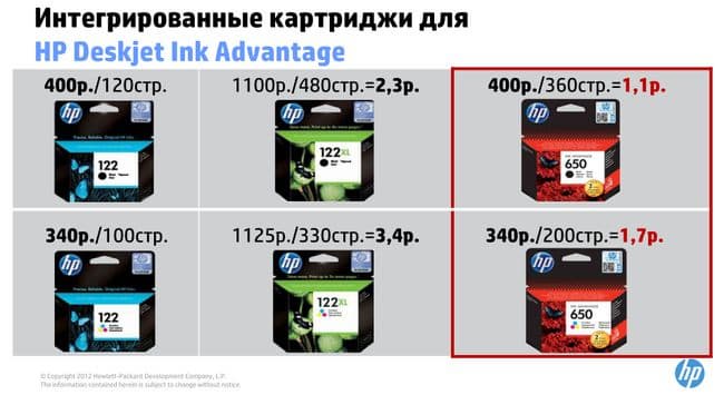 Картридж № 650 предназначен для младших моделей линейки и представляет собой интегрированную систему, т. е. все цветные чернила находятся в одном картридже. Старшие модели работают на картриджах № 655, где для каждого цвета печати используется отдельный картридж.