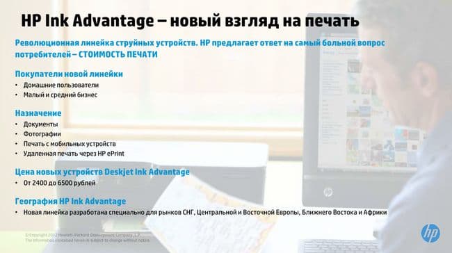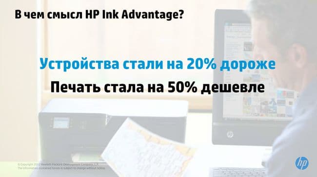 НР Ink Advantage, по словам представителей компании, представляет собой новый взгляд на печать. Посмотрим внимательнее на слайд: