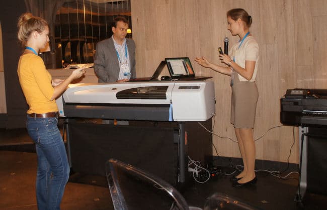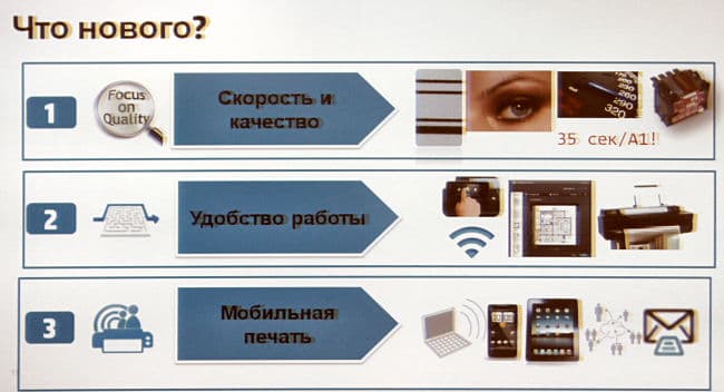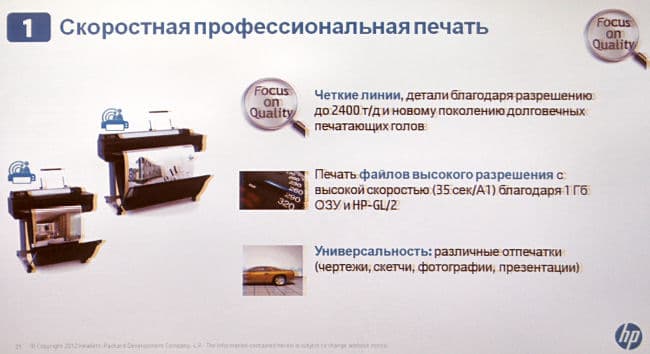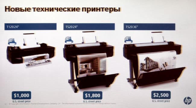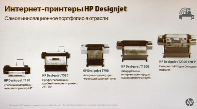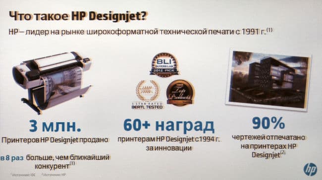 Это линейка профессиональных и полупрофессиональных широкоформатных принтеров. НР очень давно работает на этом рынке и является безоговорочным лидером — я так понял, что у нее даже конкурентов-то как таковых нет. На это намекает правая часть слайда с упоминанием о том, что на принтерах Designjet напечатано 90% всех чертежей.