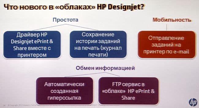 Итак, вот мы и добрались до самого интересного. Новые принтеры поддерживают и различные облачные функции для печати. Технология называется HP Designjet ePrint&Share и представляет собой некий аналог ePrint, только оптимизированный под корпоративные, а не под домашние решения.
