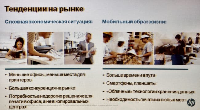 Судя по тому, как сгруппированы пункты в слайде Hewlett-Packard, можно выделить два основных направления изменений: повышение требований к эффективности (покупатели хотят тратить меньше денег, меньше места…) и меняющаяся парадигма использования электронных устройств, которая все больше захватывает и профессиональных пользователей.