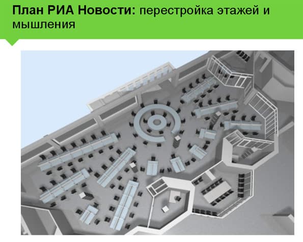 В РИА Новости уже переходят к использованию нового способа подачи информации — не успев перестроиться технически, редакция пытается создавать конвергированный продукт: к новости прикрепляются фотоленты, обсуждение, инфографика, видеоматериалы. В ближайших планах РИА Новости — глобальные изменения. Наталья Лосева подчеркнула, что работа над конвергированным продуктом вынуждает перестраивать организацию процесса и… здания. Скоро офис информационного агентства переедет в новое, более удобное для работы в новом ключе помещение с особой планировкой.