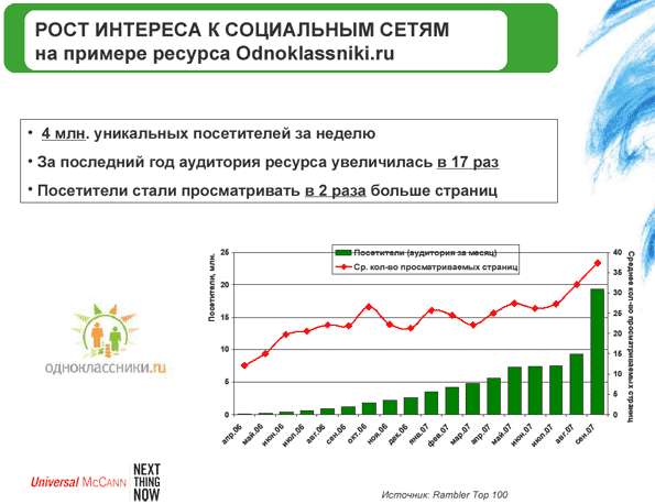 Кстати, о темпах роста блогосферы в рамках своей презентации рассказала Евгения Семина (рекламное агентство Universal McCann). Она поделилась результатами масштабного исследования Universal McCann, направленного на изучение вовлеченности аудитории в пользование сервисами Веб 2.0 (создание и потребление контента, социальное взаимодействие и участие в социальных сетях). Цифры были озвучены очень оптимистичные — Россия, оказывается, лидирует среди европейских стран по уровню вовлеченности в социальные сети, — если бы не одно но: респонденты репрезентировали активных интернет-пользователей, а в нашей стране они, как известно, сосредоточены в основном в нескольких мегаполисах… А в остальном картина складывается приятная: