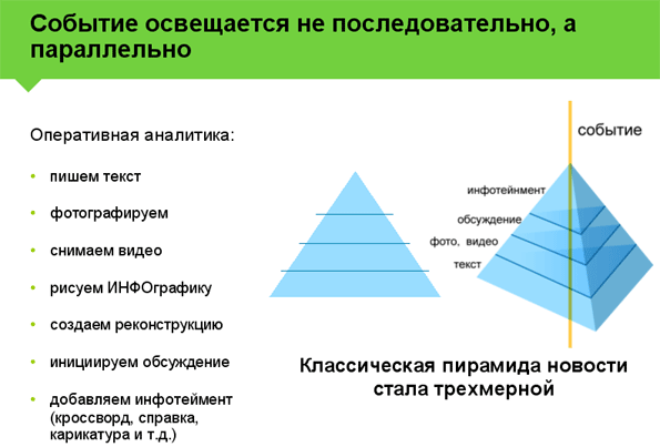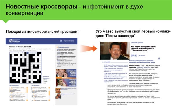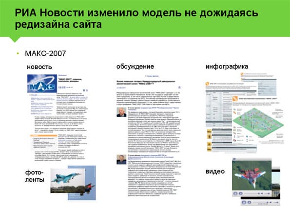 В РИА Новости, например, конвергенцию рассматривают как стратегию конкуренции в мультиформатном пространстве, как технологический и концептуальный ответ на вызов и социальный заказ аудитории. «Пользователь сегодня хочет видеть, слышать и читать одновременно. Он хочет получать информацию там, где ему удобно, тогда, когда он хочет, и на том носителе, который у него есть под рукой, — отметила Наталья Лосева. — Чтобы остаться востребованным, нужно чувствовать этот импульс и освещать событие не последовательно, а параллельно».