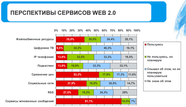 - В целом Россия занимает седьмое место в мире по уровню вовлеченности в технологии Веб 2.0, оставляя позади США и такие европейские страны, как Франция, Великобритания и другие.