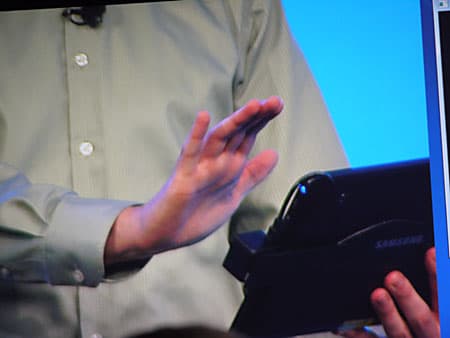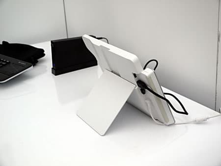 На практике работу такого датчика показали в паре с планшетом Samsung, на фото датчик (прототип) виден в виде прямоугольной коробочки, прикрепленной с правого края планшета. В законченных продуктах датчик можно будет просто интегрировать в корпус планшета.