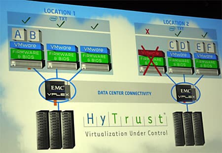 Далее на сцене коснулись вопроса безопасности дата-центров при их связи между собой, виртуализации сервисов и при миграции на новое оборудование. Тут Intel сотрудничает с EMC2, а для обеспечения безопасности используются технологии Intel Trusted Execution Technology (TXT) и EMC2 HyTrust.