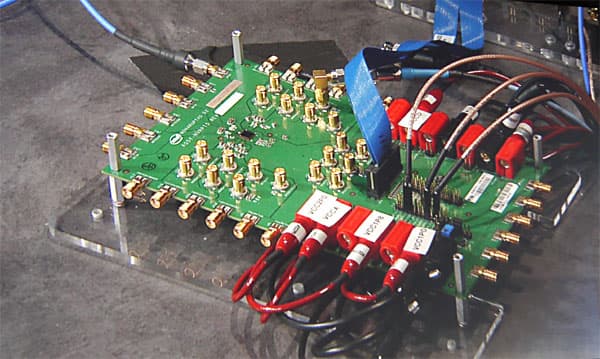 Работу в связке двух таких радиомодулей продемонстрировали прямо на сцене, платы были довольно габаритные, но лишь вследствие того, что это тестовые прототипы на базе FPGA с кучей разъемов для разных типов антенн: