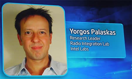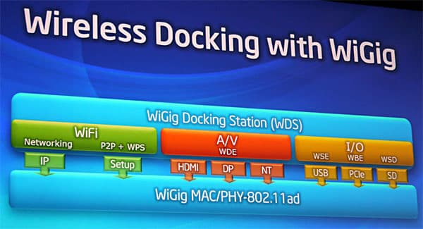 На сцену вышел Ali Sadri (Али Садри), президент WiGig Alliance и директор подразделения mmWave Technology корпорации Intel. Как следует из названия, область его деятельности — это миллиметровый волновой диапазон. Дело в том, что именно в этом диапазоне при частотах порядка 60 ГГц можно существенным образом избавиться от проблем интерференции. Решения WiGig должны обеспечить мгновенную синхронизацию мобильных устройств с облаками, между собой и с другими компьютерными системами (например, настольными ПК), беспроводное соединение с экранами (например, для воспроизведения видео со смартфона на телевизоре), беспроводное подключение ноутбуков и планшетов к док-станциям и, разумеется, беспроводный доступ в интернет. Текущая реализация WiGig обеспечивает пропускную способность в 7 Гбит/с.