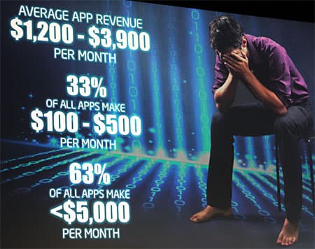 Сейчас компьютеры распространены повсеместно, это уже не диковинная вещица, а обыденное устройство, помогающее в работе и в быту. Но компьютеры без приложений будут просто грудой бесполезного дорогостоящего оборудования. Вот о тяжелой доле разработчиков приложений и пошла речь на сцене. Рене привела данные со ссылкой на Vision Mobile, на основании которых складывается довольно грустная картина. В среднем разработчик мобильных приложений зарабатывает на продажах результатов своего труда $1200-3900 в месяц, при этом 33% приложений, продающихся на рынке, приносят своим создателям в среднем $100-500 в месяц, а еще 63% — менее $5000 в месяц.