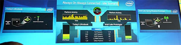 Слева отображается обычный ультрабук, а справа — с поддержкой Spring Meadow. Хорошо видно, что в режиме постоянного подключения к сети система слева постоянно нагружена, а система справа загружена дискретно, что и позволяет существенно экономить расход заряда аккумулятора.