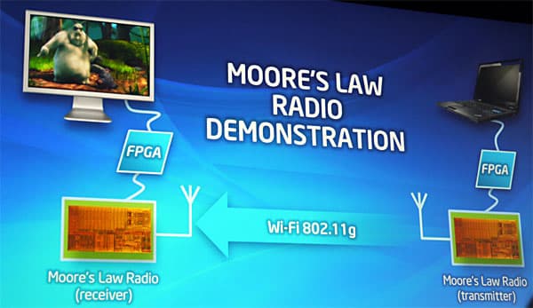 Чтобы демонстрация работы цифровых радиомодулей была наглядной, к одному из них подключили ноутбук, на котором воспроизводилось видео, и сигнал по Wi-Fi (802.11g) через Wi-Di передавался на другой радиомодуль, и затем принятое видео воспроизводилось на подключенном экране: