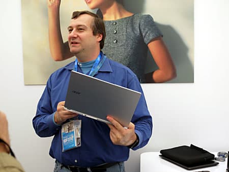 Зато показали ультрабук Acer Aspire S7, корпус которого выполнен из композитного материала, экран 11″, IPS-матрица, разрешение 1336×768, толщина корпуса 12 мм, масса всего 996 г; в режиме серфинга по интернету он должен жить от батареи до 7 часов (хотя это, скорее всего, не так), в режиме просмотра видео — существенно меньше, в зависимости от типа проигрываемого видео (если видео в H.264, то за счет аппаратного декодирования расход емкости аккумулятора будет меньше, чем, например, при проигрывании DivX).