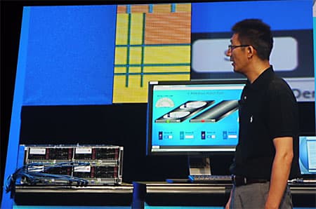 Затем тема сменилась на вопрос развития и построения сетевых инфраструктур для беспроводной связи. В рамках IDF 2011, т. е. год назад, публике была продемонстрирована базовая станция LTE, построенная на основе стандартного аппаратного обеспечения для платформы x86. Такое решение обладает неоспоримым преимуществом в плане модернизации, т. е. достаточно обновить программное обеспечение — и будет реализована поддержка новых протоколов и стандартов связи. Разработка такого подхода к созданию базовых станций для сотовых сетей ведется совместно Intel и крупнейшим оператором China Mobile. На сцену вышла доктор Чин Лин Ай, научный руководитель института исследований China Mobile.