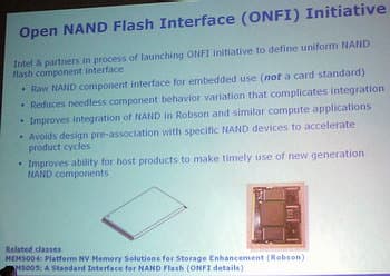 Сначала — об инициативе нового интерфейса ONFI (Open NAND Flash Intlerface) для NAND флэш-памяти. Это не новый стандарт памяти, а новый интерфейс для этого стандарта памяти. Некоторые категории этой памяти сложно разрабатывать из-за проблем с размещением. Для разработки новых типов этой памяти требуется более сбалансированный подход. Рабочая группа по ONFI будет окончательно сформирована где-то после IDF на Тайване этой весной.