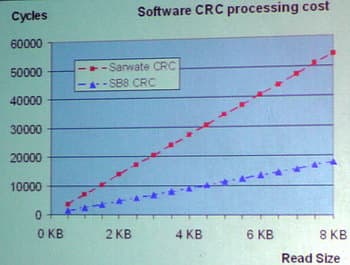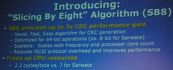 Три главных направления исследований сейчас здесь — это прямое обращение (seamless access), КМОП-радио и «Slicing by Eight» (расщепление на 8). Суть последнего заключается в следующем. При сетевых обменах необходимо быть уверенным в целостности данных. Сейчас это обеспечивается при помощи CRC-контроля. При этом существенно снижается количество ошибок в данных, однако генерация CRC расходует очень большое количество процессорных циклов, что снижает производительность систем. То есть CRC — это узкое место современных сетевых систем. Например, в Intel провели много анализов серверных систем и нашли, что CRC сильно снижает производительность систем с iSCSI.