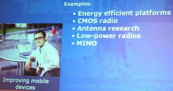 Как Intel собирается добиться этого? Используются различные технологии оптимизации систем приема-передачи. Примеры направлений оптимизации: энергетически эффективные платформы, КМОП-радио, исследования антенн, маломощные радиосистемы, MIMO (см. ниже).