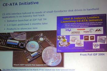 Что же касается нового интерфейса CE-ATA для компактных устройств хранения данных, то спецификации версии 1.0 были опубликованы спустя 6 месяцев после первого упоминания на IDF Fall 2004. И продукты с поддержкой CE-ATA уже представляются на шоу в рамках этого IDF.