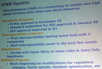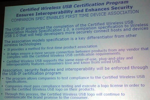 Проанонсировано завершение спецификаций по Certified WUSB 1.0. Intel завершит силикон С-WUSB во втором квартале этого года. С-WUSB должна выйти на рынок значительно быстрее, чем в свое время USB-варианты: компания извлекла уроки из прошлого, когда USB 1.1 и 2.0 завоевывали рынок очень долго.