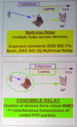 Второй путь решения — это Ensemble Relay: кластеры приборов от виртуальной MIMO, одновременная передача кодированных PHY-пакетов.