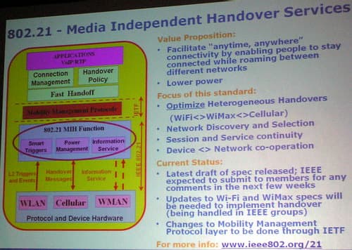 Этот стандарт (см. также www.ieee802.org/21) призван оптимизировать взаимодействие между разными категориями устройств: Wi-Fi , WiMAX и сотовой связью. Появление его ожидается в 2007. И в конце концов 802.21 заменит все три стандарта в один общий для всех устройств.