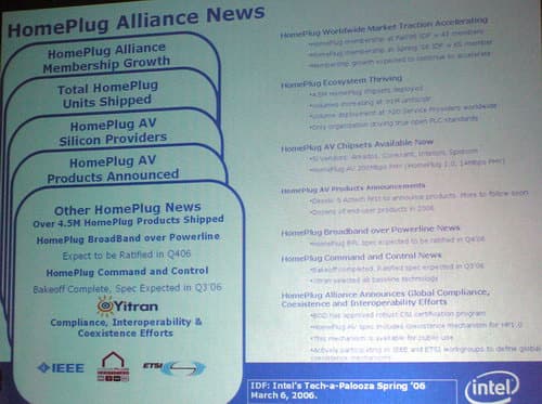 Об этом Intel уже рассказывала на прошлом IDF. Суть системы — организация компьютерной сети по бытовой сети электропитания при помощи специальных адаптеров. С прошлого IDF здесь появились новые скорости и стандарты. Количество членов альянса HomePlug за последние полгода возросло с 43 до 65, продано уже 4,5 миллионов контроллеров для этой системы и планируемый рост составляет более миллиона штук в квартал. Сейчас ведется разработка новой версии этого стандарта — HomePlug AV, позволяющей передавать данные со скоростью до 200 Мбит/с (у HomePlug 1.0 — всего 14 Мбит/с). Новые спецификации будут закончены в третьем квартале этого года. Чипсеты для HomePlug AV уже доступны членам Альянса.