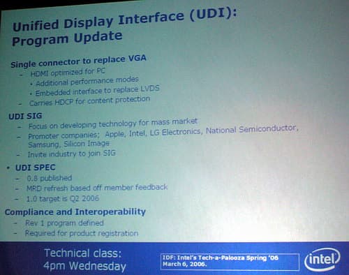 В первом из выступлений было рассказано о новом универсальном стандарте для видеоинтерфейсов, пригодном для применения не только в компьютерной технике, но и в более широком спектре продуктов. Развиваемый стандарт, получивший название Unified Display Interface (UDI) имеет цель заменить устаревший VGA-стандарт для дисплеев.
