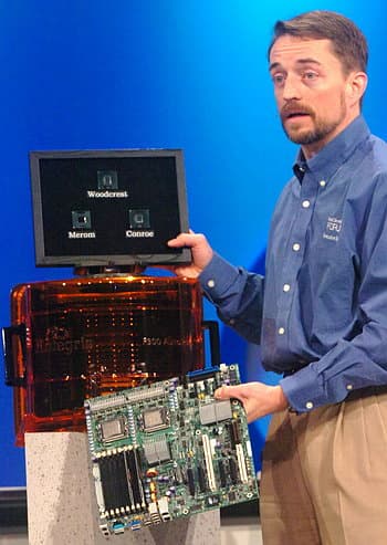 недавно отрастивший стильную бородку, которая одним нравится, а другим почему-то нет. Показав «для затравки» живьем все три ближайших процессора с Intel Core Microarchitecture — Merom, Conroe и Woodcrest, — а также бокс с 300-мм кремниевыми пластинами с этими кристаллами и плату готового сервера на Woodcrest,
