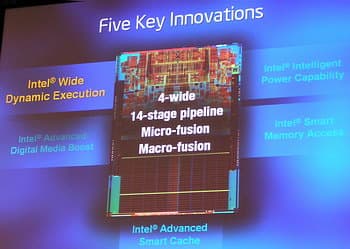 Прежде известная как Intel New Generation Microarchitecture, объявленная здесь, на IDF Intel Core Microarchitecture объединяет в себе лучшие решения из прежних микропроцессорных архитектур Intel, добавляет немало нового и воплощается в процессорах Merom, Conroe и Woodcrest, о которых Intel уже рассказывала подробно на прошлом IDF в августе и которые служат надеждой (на очередной прорыв) корпорации на пути завоевания новых рынков и сохранения за собой прежних. Подробнее об этих процессорах и Intel Core Microarchitecture (ICM) мы поговорим в другой раз, тем более что на этом IDF было раскрыто немало технических подробностей о ней и продуктах на ее базе, а сейчас просто упомянем, что пятью китами, на которых строится ICM, на данный момент являются